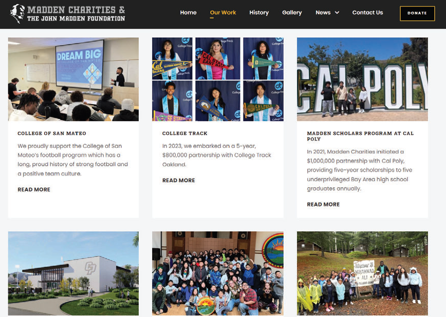 We are pleased to announce the redesign of our website. It now includes information about our partnerships and the charities we support, along with news articles, press releases, and even photos. Visit maddencharities.org to learn more and see the impact of your generosity.