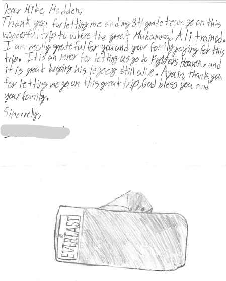 Madden Charities charters buses to bring local Pennsylvania students to Muhammad Ali’s historic boxing training camp. On these field trips, students are taken on a tour of the camp where they learn about Ali’s legacy. During their visit, they enjoy pizza from a local pizzeria, and sometimes even get to meet famous boxing legends like Tim Witherspoon!